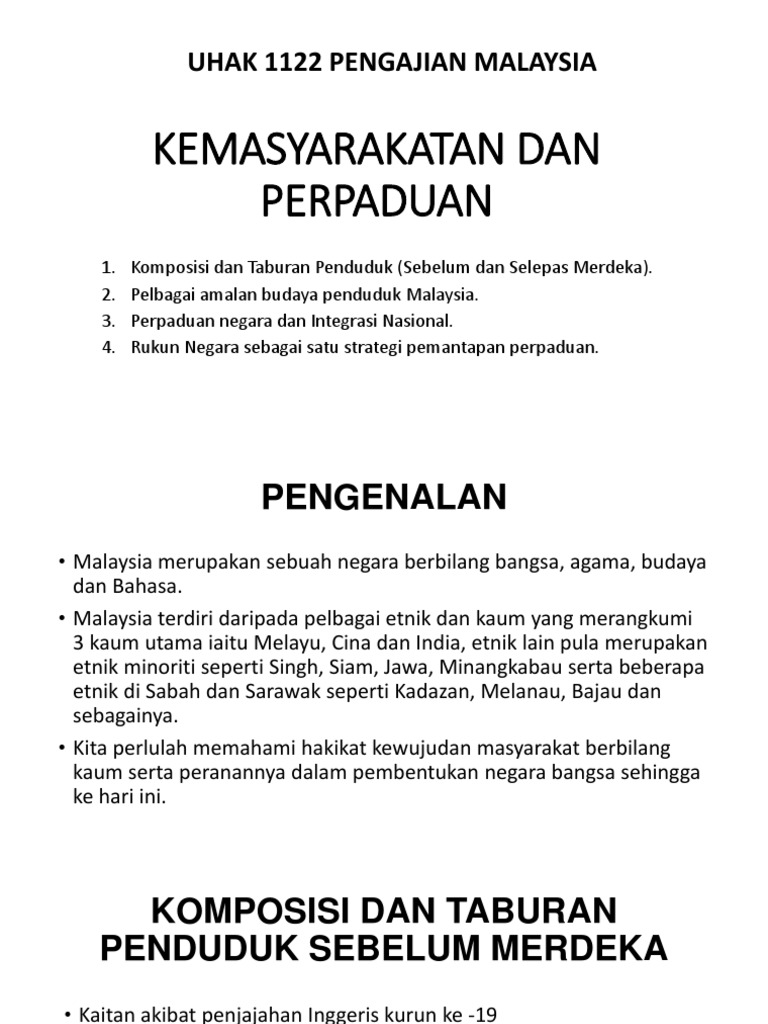 Penetapan dasar dan sistem pendidikan yang sempurna bagi setiap warganegara malaysia. Pengajian am kenegaraan malaysia, mohd. Ahli kumpulan saranya gengan shivitta moorty gogilavaani muthasamy. Di sekolah, integrasi nasional dibentuk dan terlihat dari beberapa kegiatannya. Perpaduan negara dan integrasi nasional. Integrasi nasional bangsa indonesia berarti hasrat dan kesadaran untuk bersatu sebagai suatu bangsa, menjadi satu kesatuan bangsa secara resmi, dan direalisasikan dalam satu kesepakatan atau konsensus nasional melalui sumpah pemuda pada tanggal 28 oktober 1928. Penghayatan penghayatan rukun negara untuk mencapai perpaduan dan integrasi nasional yang padu lagi jitu dilaksana dilaksanakan kan di negara negara 4. Perpaduan nasional amat penting bagi menjamin negara malaysia yang terus stabil dari segi social,ekonomi dan politik. Dari segi definasi integrasi adalah satu proses yang menyatupadukan pelbagai kelompok dalam masyarakat melalui satu identiti bersama. Pembinaan negara bangsa bagi sebuah negara berbilang kaum seperti malaysia adalah amat penting terutama dalam era globalisasi yang membenarkan kini menjadi tanggungjawab semua kaum, baik yang tua dan muda untuk mempertahankan kemakmuran dan perkukuhkan perpaduan negara ini. 5 rukun negara malaysia (pengajian malaysia). Integrasi nasional & perpaduan negara malaysia didiami oleh sebuah masyarakat majmuk. Proses penyatuan dari semua aspek fizikal, sosial, ekonomi dan politik termasuk aspek biologikal (kesanggupan 1.