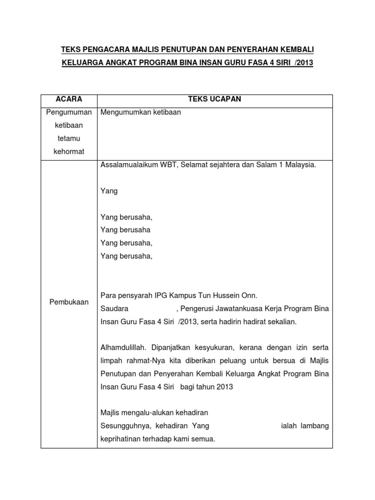 1 from Savesave teks pengacara majlis perasmian program jom membac. Mengumumkan ketibaan yang diraikan en. Contoh teks terbaik dan lengkap dari mula program sehingga akhir penutup. Membawakan dari auditorium seri perdana ,pertandingan pidato peringkat daerah jasin melaka bandaraya bersejarah. Muhammad hissam bin sani diiringi tuan pengetua masuk ke dalam dewan. Termasuk pengalaman yang satu ini. Contoh teks pengacara majlis / ucapan emcee majlis persaraan cikgu. Muhammad hissam bin sani diiringi tuan pengetua masuk ke dalam dewan.